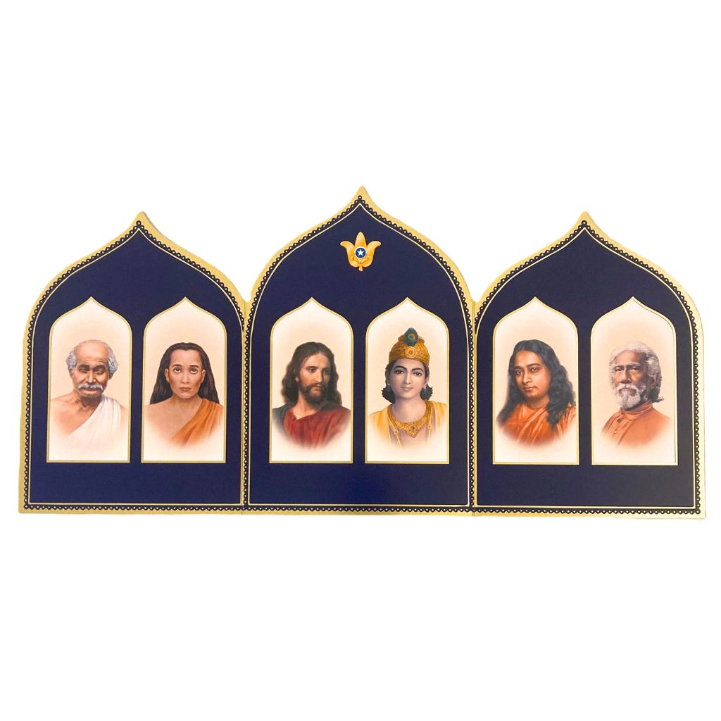 Esta é uma reprodução em cores do altar da Self-Realization Fellowship, projetado por Paramahansa Yogananda. Fácil de transportar, pois pode ser dobrado para viagens, e também é adequado para emoldurar. Fica em pé quando parcialmente aberto.