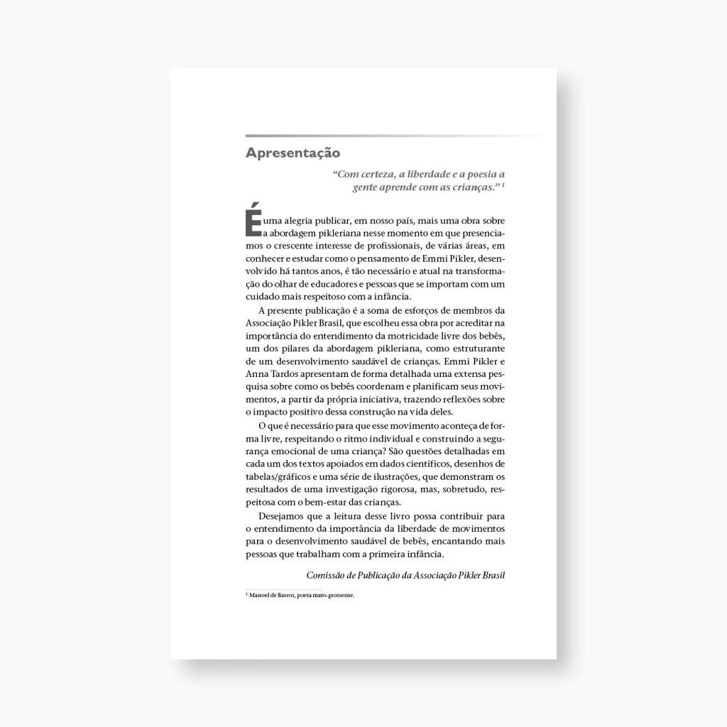 Este livro apresenta a Abordagem Pikler a partir dos escritos da própria Emmi Pikler e de estudiosos que deram continuidade ao seu legado. Com base em décadas de observações no Instituto Lóczy — atual Casa Pikler — a obra oferece uma visão profunda e embasada sobre a motricidade livre dos bebês como base para um desenvolvimento integral, respeitoso e harmonioso.