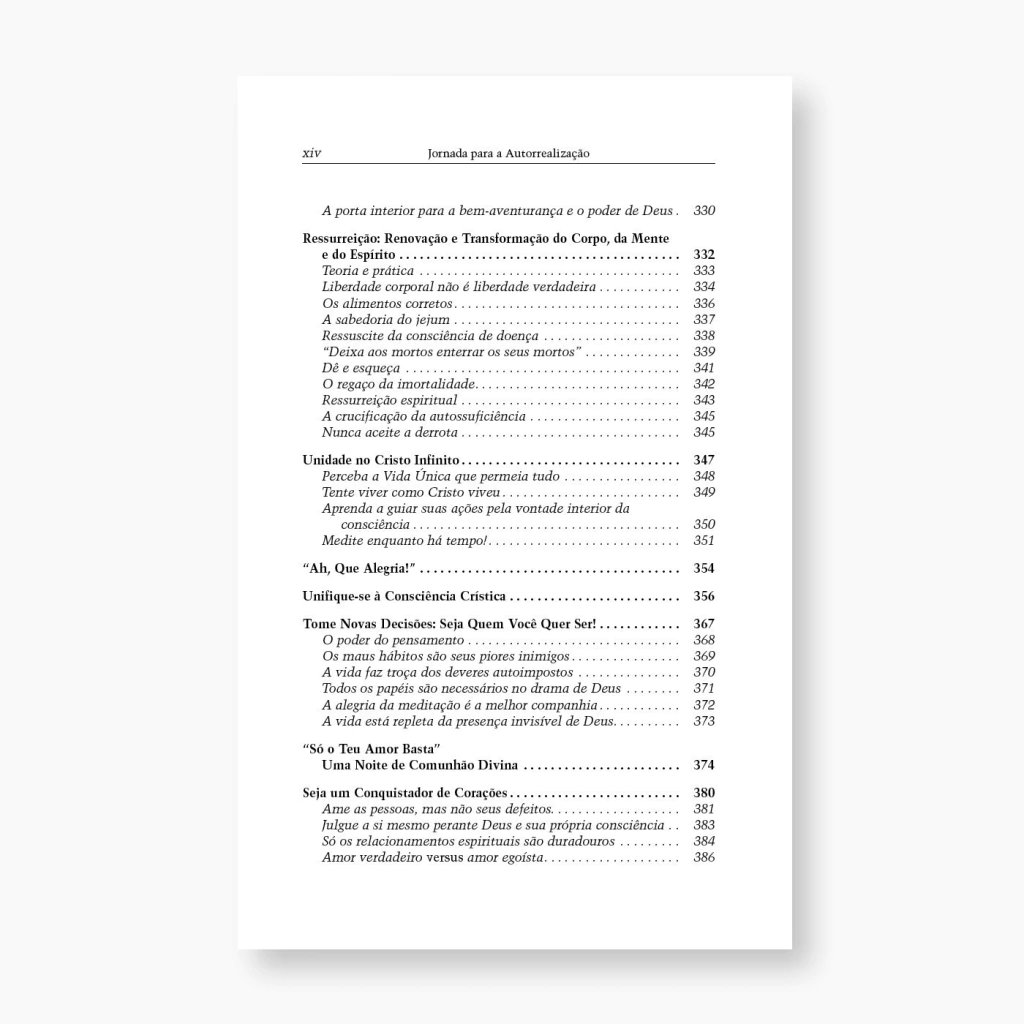 "Jornada para a Autorrealização" é o terceiro volume da coletânea de palestras de Paramahansa Yogananda, um dos maiores mestres da ciência da meditação iogue. Tal qual o primeiro e o segundo volumes (A Eterna Busca do Homem e O Romance com Deus), esta obra traz profundas revelações de como a ciência da Yoga pode auxiliar o homem contemporâneo a lidar com suas questões cotidianas e existenciais.